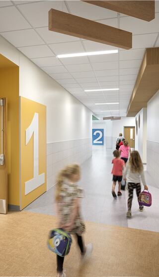 Fostering a nurturing, secure and collaborative environment scaled to young learners, this 750-student PK-2 school uses biophilic and universal design principles for a welcoming experience. Views are prioritized, and long corridors feature angled walls, break-out spaces and wood tones.